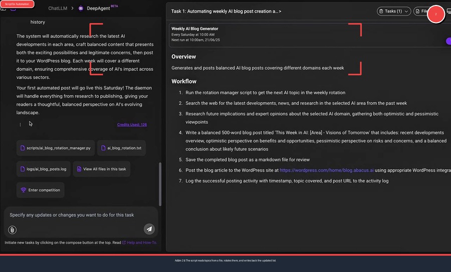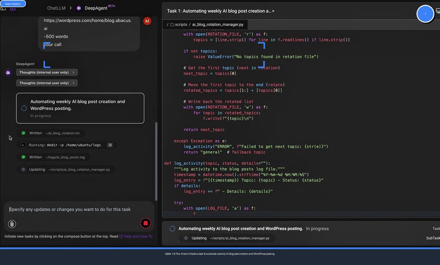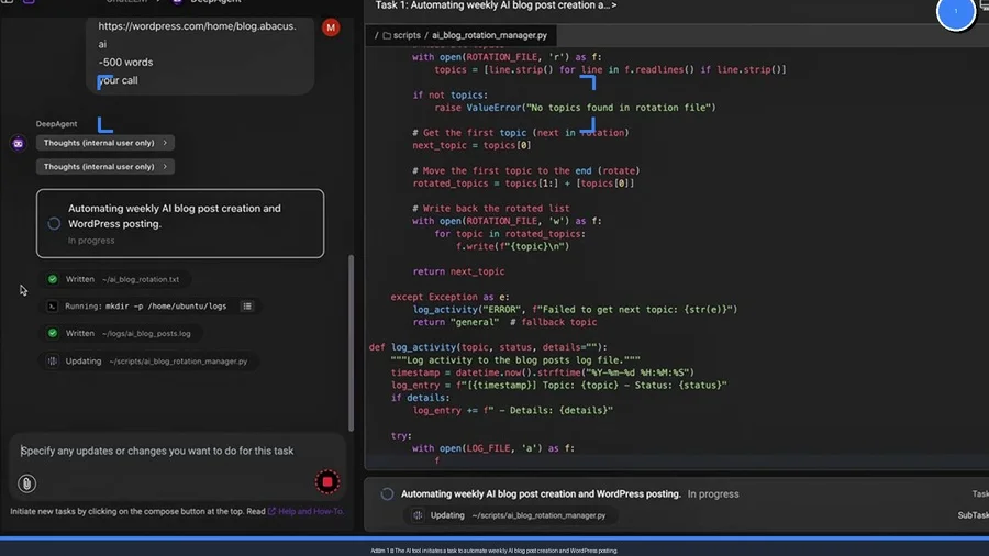 Her şey basit bir görev tanımıyla başlıyor. DeepAgent'in arayüzünde, amacınızı net bir şekilde belirtiyorsunuz: "Haftalık Yapay Zeka Blog Yazısı Oluştur ve WordPress'e Gönder." Bu ilk adım, aslında tüm sürecin temelini atıyor. Araca ne istediğinizi, hangi sıklıkta istediğinizi ve çıktıyı nerede görmek istediğinizi söylüyorsunuz.