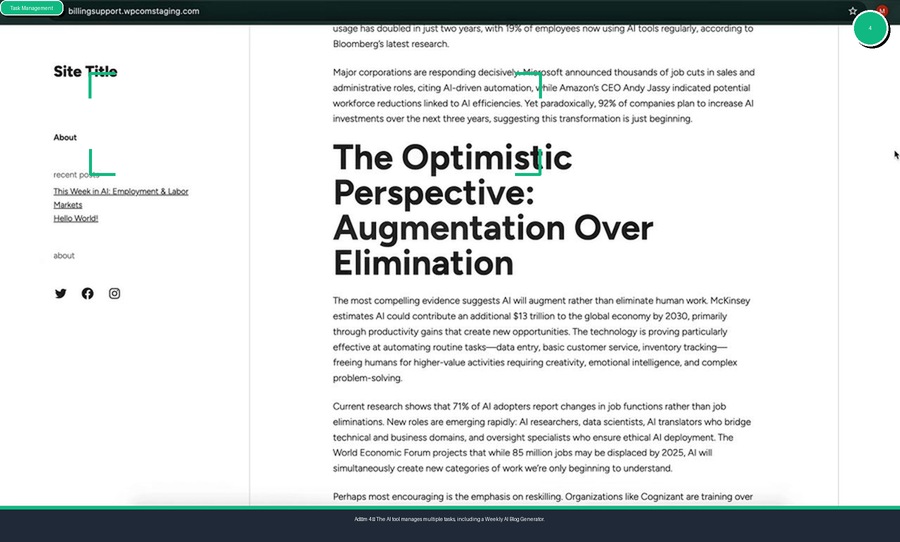 Tüm bu adımların sonunda ne elde ediyoruz? WordPress sitenizde, sizin belirlediğiniz konuda, özenle araştırılıp yazılmış, yayına hazır bir blog yazısı. Ekran görüntüsündeki örnekte, "Yapay Zekanın İşler Üzerindeki Etkisine İyimser Bir Bakış" başlıklı bir yazının başarıyla yayınlandığını görüyoruz.